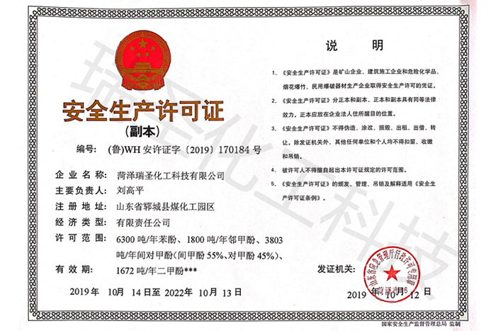 菏澤瑞圣化工科技有限公司是國(guó)內(nèi)酚類產(chǎn)品的生產(chǎn)企業(yè)。公司現(xiàn)有年加工粗酚20000萬(wàn)噸的生產(chǎn)裝置及能力,可生產(chǎn)苯酚、鄰甲酚、間對(duì)甲酚、二甲酚等產(chǎn)品。產(chǎn)品廣泛應(yīng)用于合成樹(shù)脂、香料、染料、絕緣材料、阻燃劑、農(nóng)藥、醫(yī)藥、中間體等精細(xì)化工領(lǐng)域。本公司以誠(chéng)為本,信譽(yù)保證,靠過(guò)硬的產(chǎn)品質(zhì)量和完善的服務(wù)贏得了國(guó)內(nèi)外廣大用戶的贊譽(yù)。產(chǎn)品暢銷國(guó)內(nèi)二十多個(gè)省市地區(qū),并地打入了國(guó)際市場(chǎng),產(chǎn)品遠(yuǎn)銷意大利、巴西、印度、韓國(guó)、日本、臺(tái)灣等國(guó)家和地區(qū)。